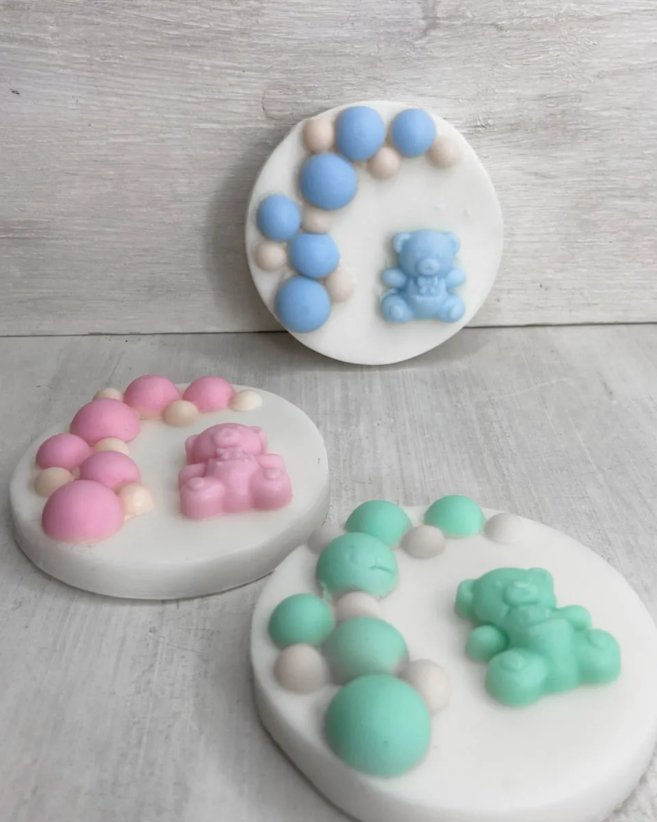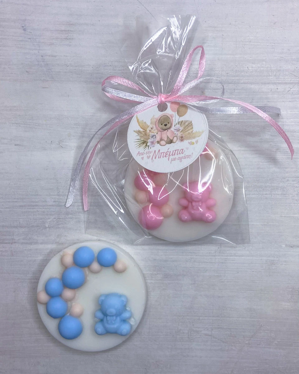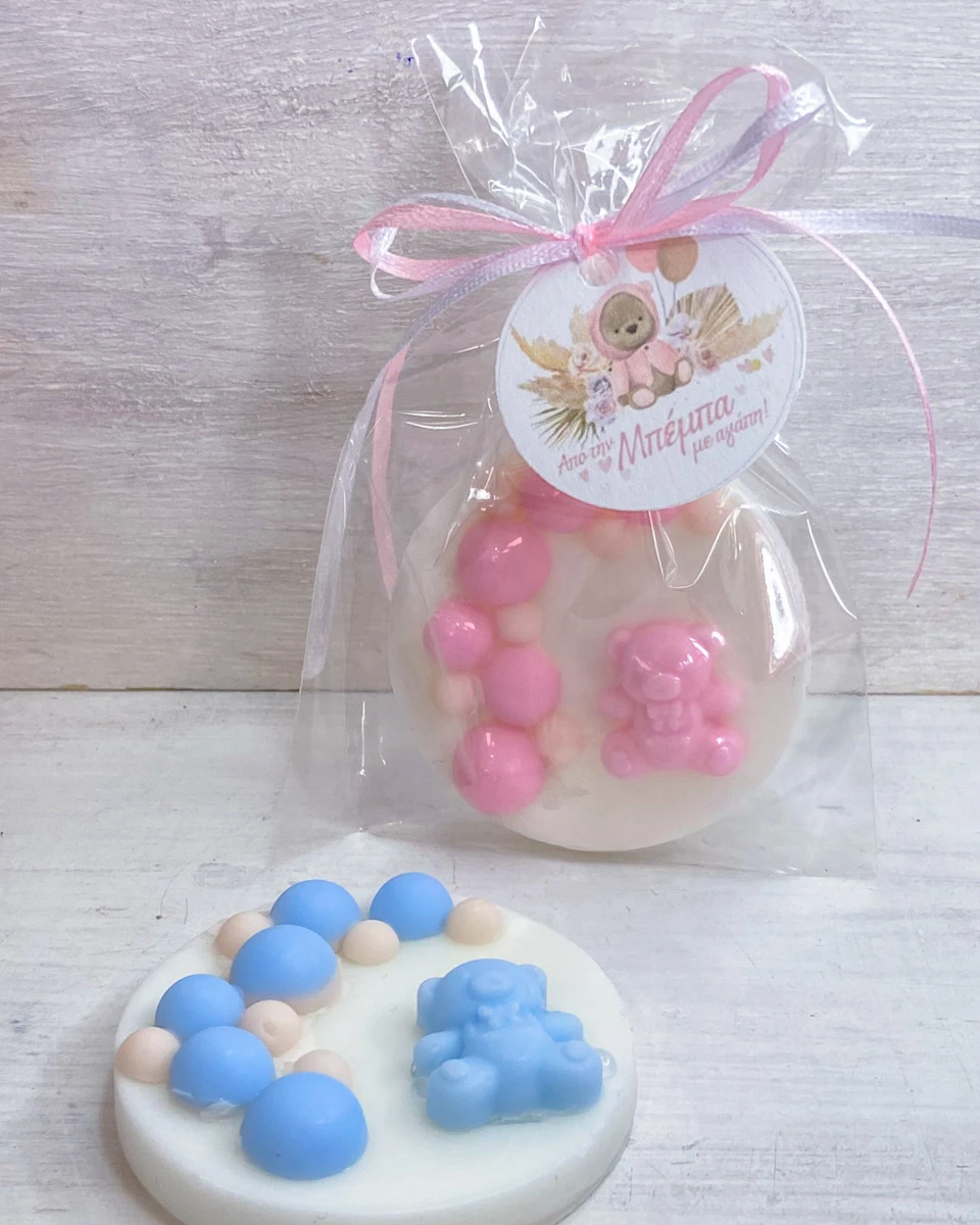 Χειροποίητο θεματικό αρωματικό κέρασμα μαιευτηρίου με σαπούνι γλυκερίνης Αρκουδάκι με Μπαλόνια Ευχαριστήριο.