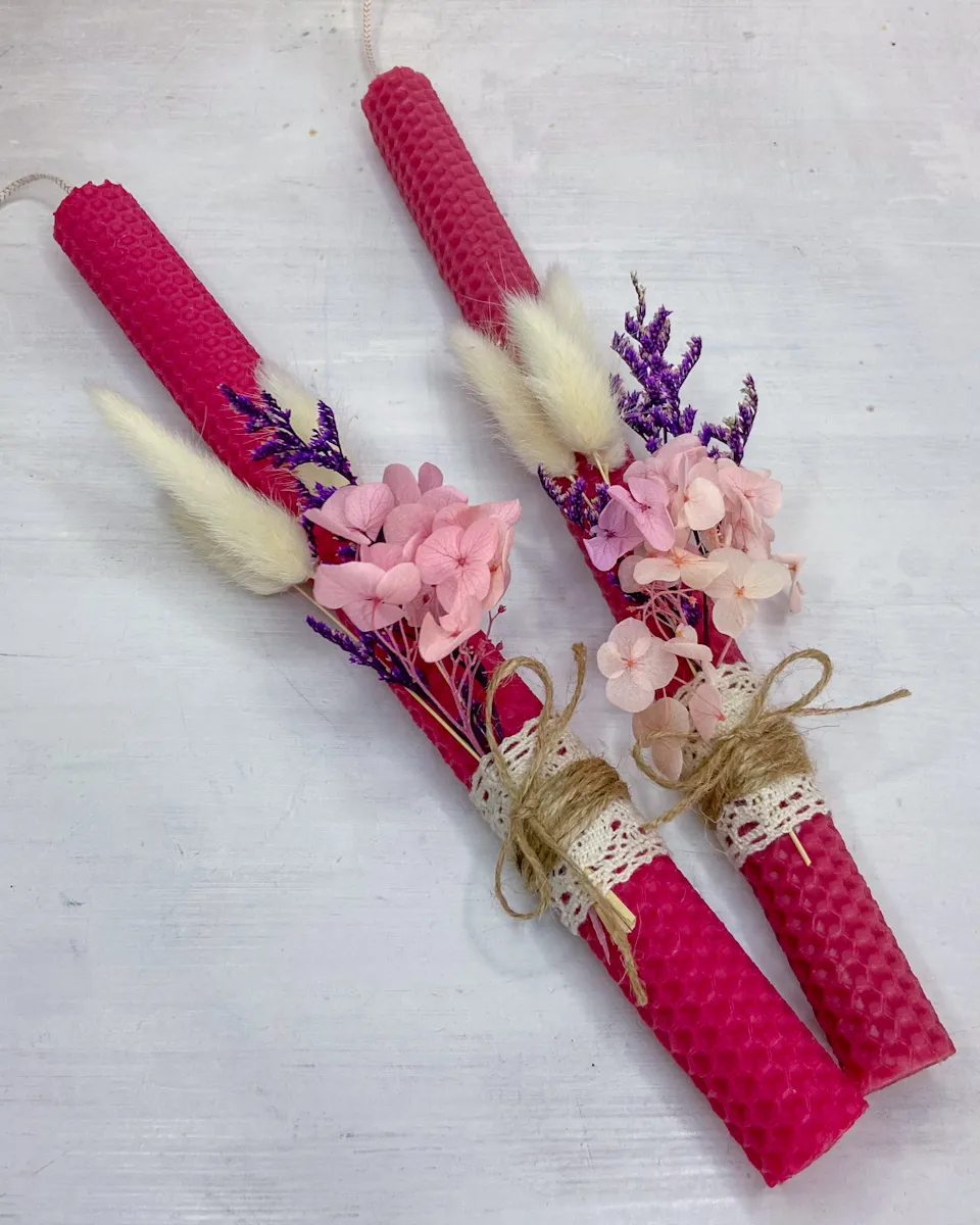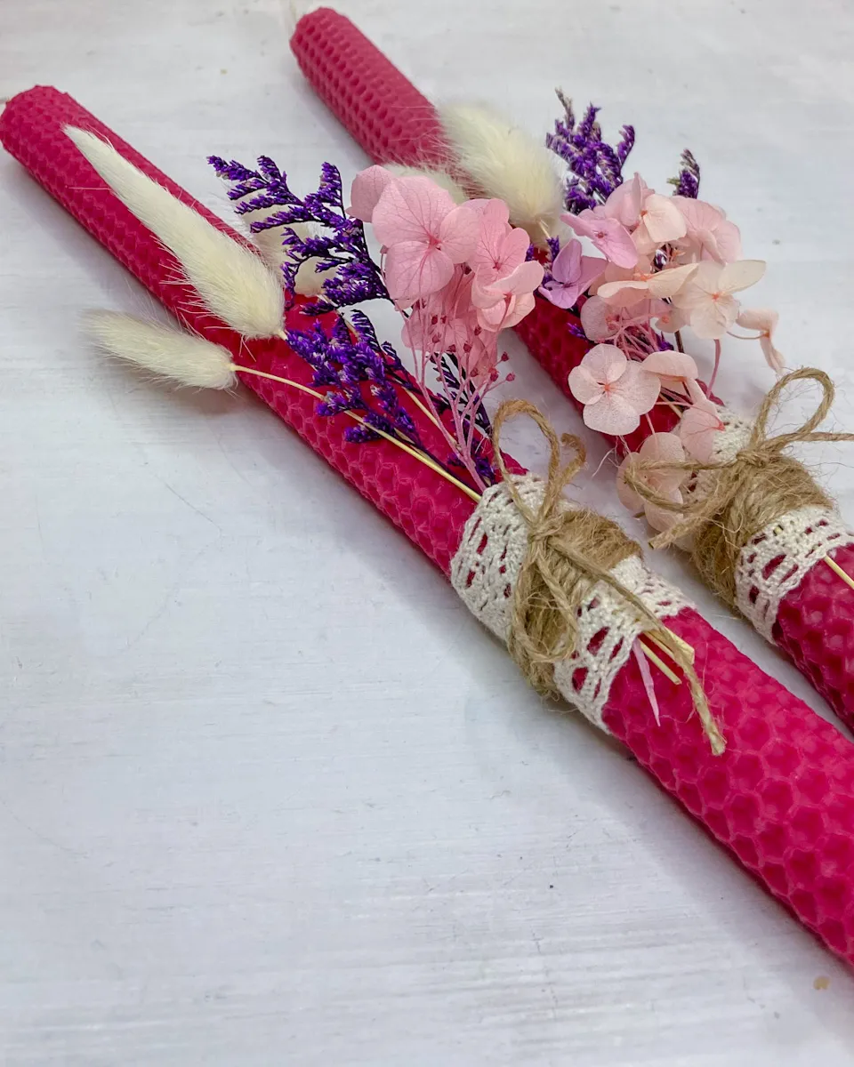 Χειροποίητη Πασχαλινή Λαμπάδα από Φύλλα Κηρήθρας σε φούξια χρώμα με αποξηραμένα και τεχνητά Άνθη, περιλαμβάνεται και η συσκευασία δώρου.
