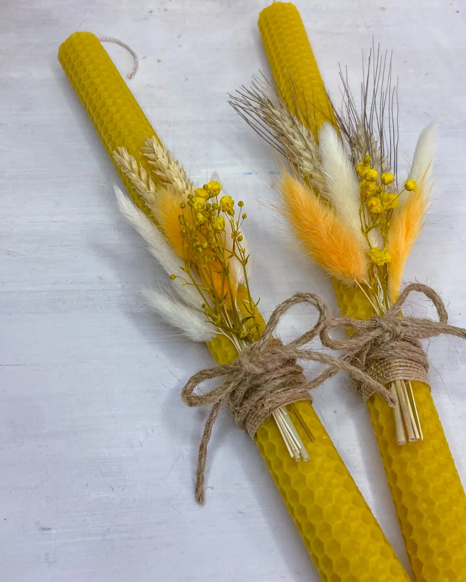 Χειροποίητη Φυσική Λαμπάδα από Φύλλα Κηρήθρας σε φυσικό χρώμα με αποξηραμένα και τεχνητά Άνθη, περιλαμβάνεται και η συσκευασία δώρου.