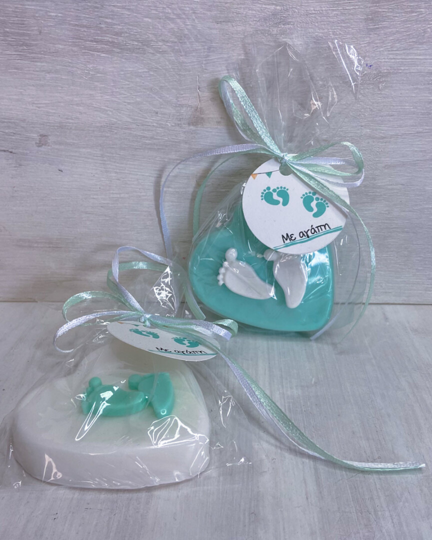 Χειροποίητο θεματικό αρωματικό κέρασμα μαιευτηρίου με σαπούνι γλυκερίνης Καρδιά με πατούσες ευχαριστήριο.