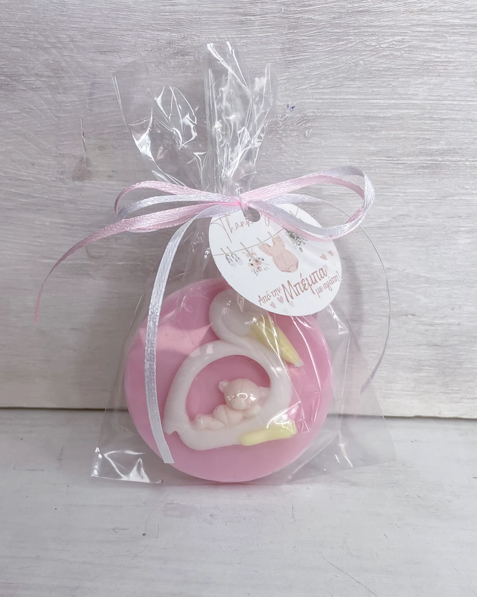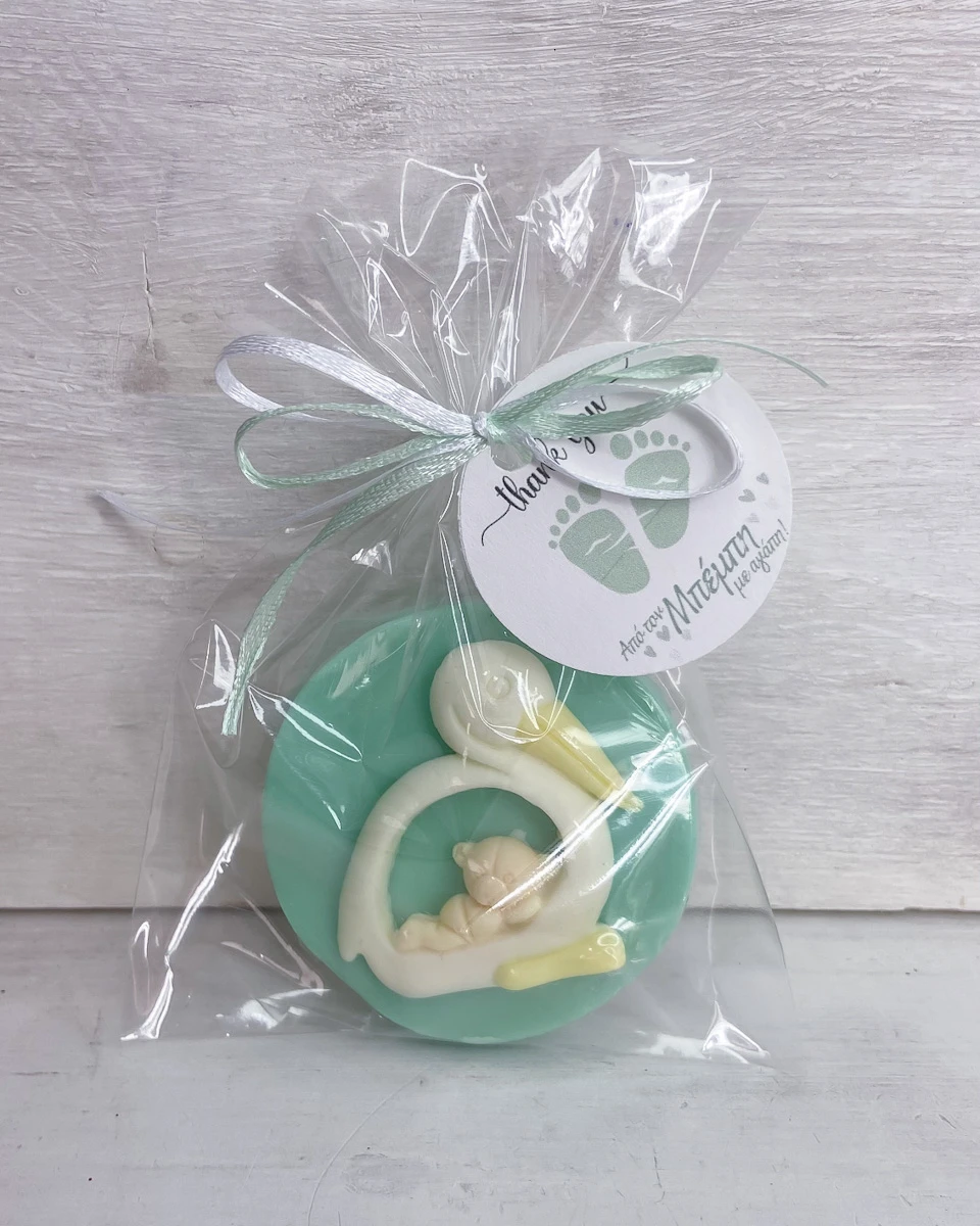 Χειροποίητο θεματικό αρωματικό κέρασμα μαιευτηρίου με σαπούνι γλυκερίνης Πελαργός Ευχαριστήριο.