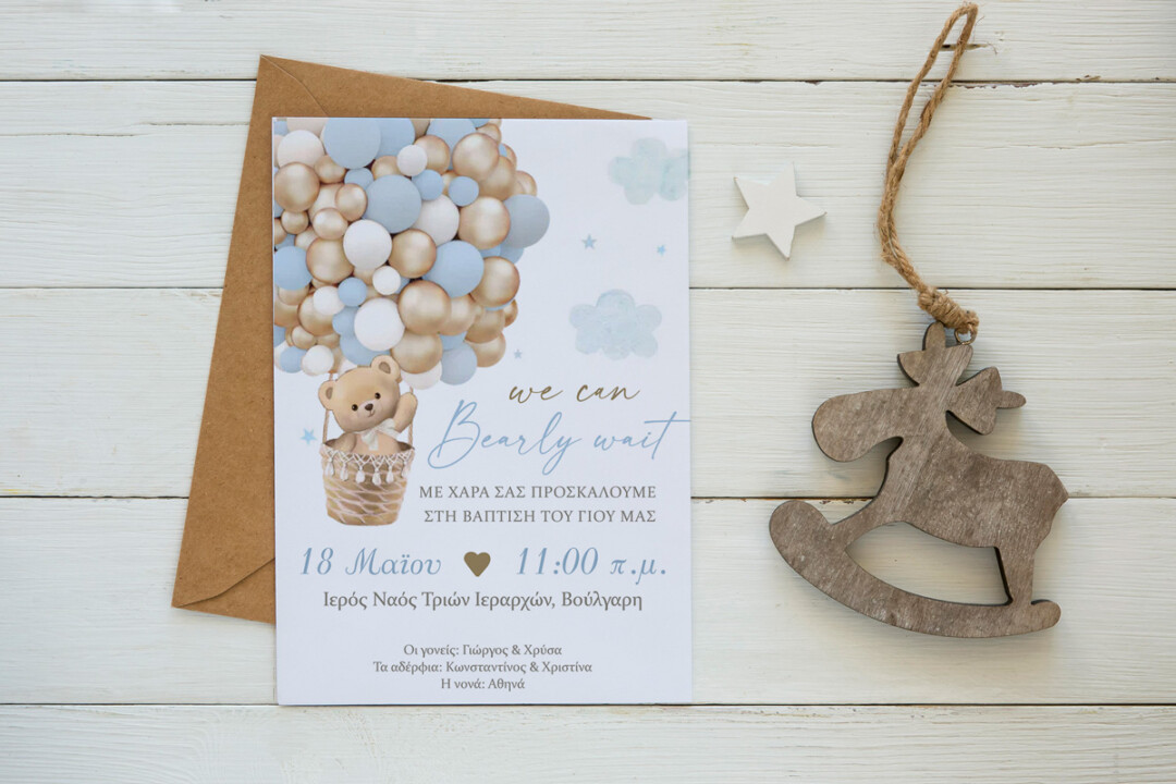 Προσκλητήριο βάπτισης Αρκουδάκι Μπαλόνια. Το δείγμα της φωτογραφίας είναι σε μέγεθος 12×17 κάρτα σε χαρτί Velvet.  Συνδυάστε το με μπομπονιέρες Αρκουδάκι και τον θεματικό στολισμό μας.