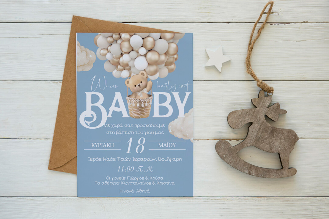 Προσκλητήριο βάπτισης Αρκουδάκι Μπαλόνια. Το δείγμα της φωτογραφίας είναι σε μέγεθος 12×17 κάρτα σε χαρτί Velvet.  Συνδυάστε το με μπομπονιέρες Αρκουδάκι και τον θεματικό στολισμό μας.