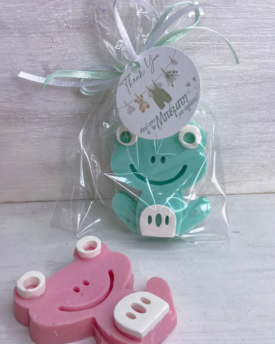 Χειροποίητο θεματικό αρωματικό κέρασμα μαιευτηρίου με σαπούνι γλυκερίνης Βατραχάκι ευχαριστήριο.